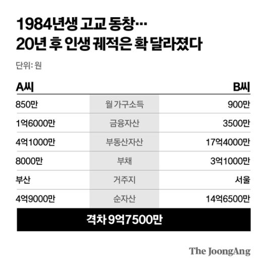 부산 출신 1984년생 두 고교 동창의 출발은 비슷했다. 사범대를 졸업한 A는 부산에서 28세에 교사가 됐고, 서울에서 대학을 다닌 B는 29세에 대기업에 취직했다. 32세에 결혼해 맞벌이 부부로 생활했다. 하지만 A는 요즘 B의 부동산 투자 성공기를 들을 때마다 자괴감이 든다. 예금 같은 금융자산은 A(1억6000만원)가 B(3500만원)보다 많다. 하지만 B가 거주 중인 아파트 시세는 17억4000만원으로 A의 아파트(4억1000만원)보다 4배 이상 비싸다. 30대 초반부터 분당과 송파에서 두 번의 ‘갭투자’(전세 낀 주택 매입)에 성공한 B는 2019년 10억원대에 서울 동작구 아파트를 사서 거주 중이다.