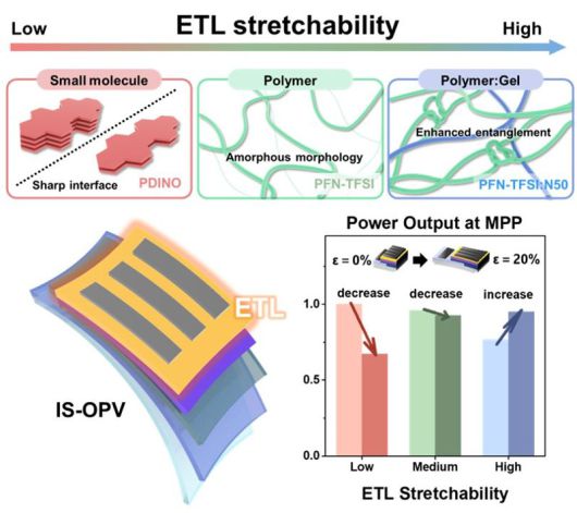 기존의 딱딱한 전자 수송층을 사용한 태양전지는 늘어날 때 전력이 33%나 줄었지만, 새로 개발한 전자 수송층을 적용한 전지는 20%까지 늘어나도 전력 변환 효율을 그대로 유지했다. 연구결과 전지 출력 전력이 0.28mW에서 0.35mW로 약 23% 증가했다는 설명이다. 단순히 유연하기만 한 것이 아니라 '늘어날수록 더 잘 작동하는 태양전지‘가 실제로 구현됐다는 것이다.