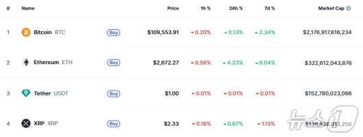 이 시각 현재 주요 암호화폐 시황 - 코인마켓캡 갈무리 |
