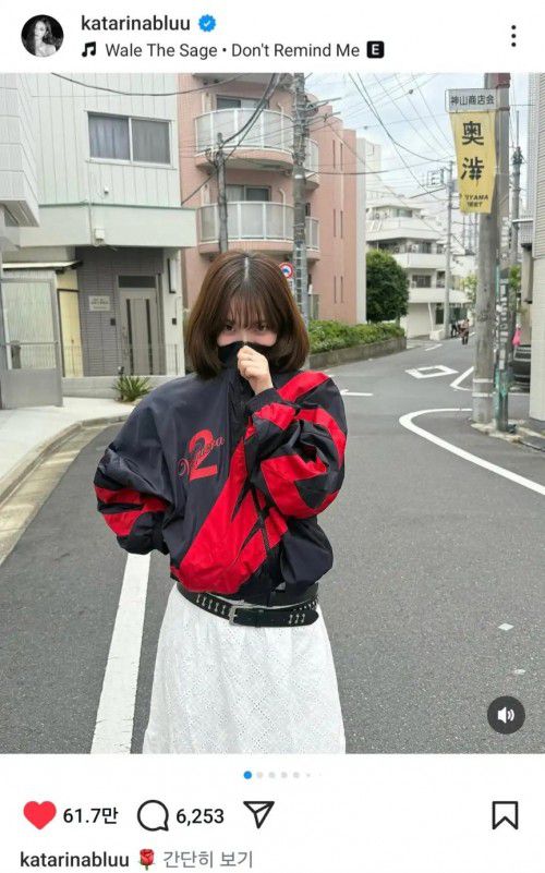 지난 27일 밤 카리나는 자신의 인스타그램에 검정색에 굵고 빨간색 줄무늬와 숫자 2가 들어간 점퍼와 화이트 스커트 차림의 사진을 올렸다. 사진 속 간판 등으로 볼 때 일본에서 촬영한 것으로 추측된다.