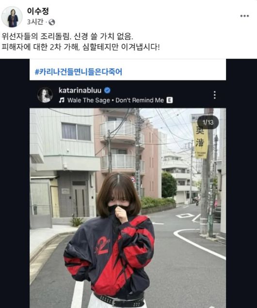 28일 이수정 국민의힘 경기 수원정 당협위원장은 자신의 페이스북 계정에 "위선자들의 조리돌림. 신경 쓸 가치 없음. 피해자에 대한 2차 가해, 심할테지만 이겨냅시다!"라는 글이 담긴 게시글을 올렸다.