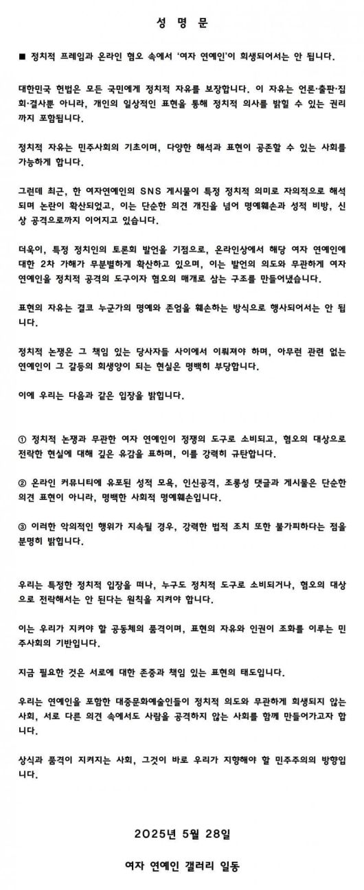 ① 정치적 논쟁과 무관한 여자 연예인이 정쟁의 도구로 소비되고, 혐오의 대상으로 전락한 현실에 대해 깊은 유감을 표하며, 이를 강력히 규탄합니다.