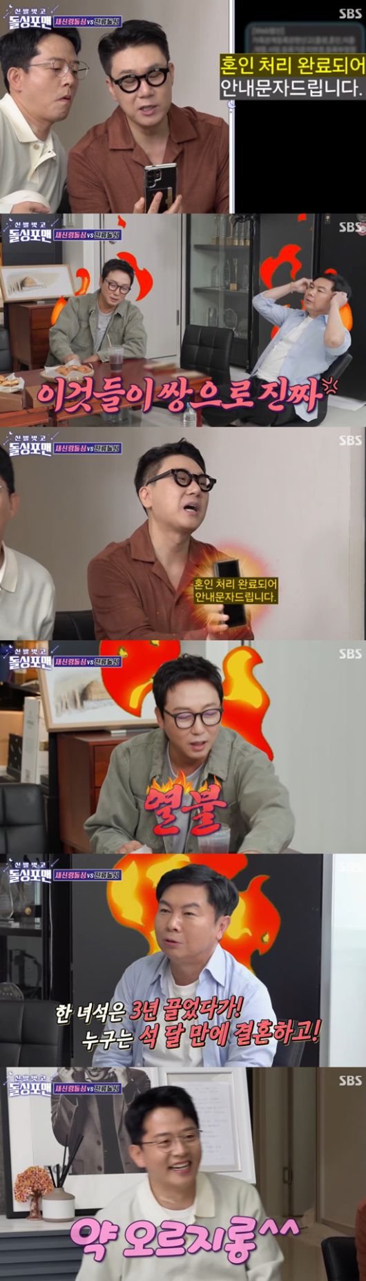 이에 탁재훈은 "이혼했다. 결혼했다. 도장 찍었다. 또 서명했다 (반복이다)"라며 질투를 표현했다. 임원희도 "한 놈(김준호)은 3년 끌었다가 누구(이상민)는 석 달만에 결혼하고 (배 아프다)"라고 말했다.