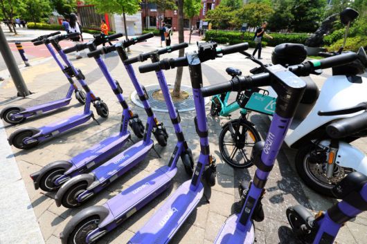 서울 시내 거리에 전동킥보드가 서있는 모습. 뉴스1 |
