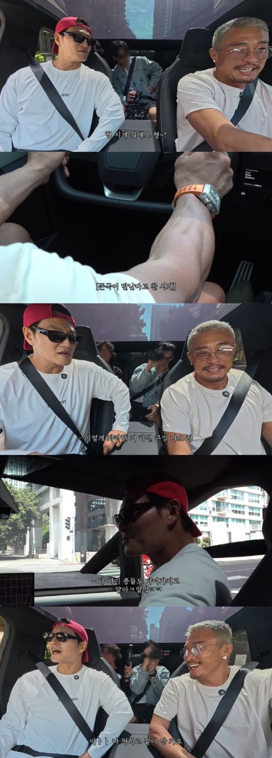 추성훈은 "큰일 나면 네가 지켜주면 된다"라며 장난스럽게 말했지만 김종국은 "여긴 다 총을 들고 다녀서 아무리 싸움을 잘해도 소용없다. 총은 못 피한다. 농담이 아니고 진짜 큰일 난다. 내가 아는 지인 2명이 최근 LA에서 강도를 당했다. 진짜 조심해야 한다. 스태프에게 맡기라"라고 했지만 추성훈은 대수롭지 않아 했다. 김종국은 "장난인 줄 아나 봐. 귀걸이도 너무 반짝인다. 나 형하고 같이 안 가겠다"라며 급 손절 선언을 해 웃음을 안겼다.