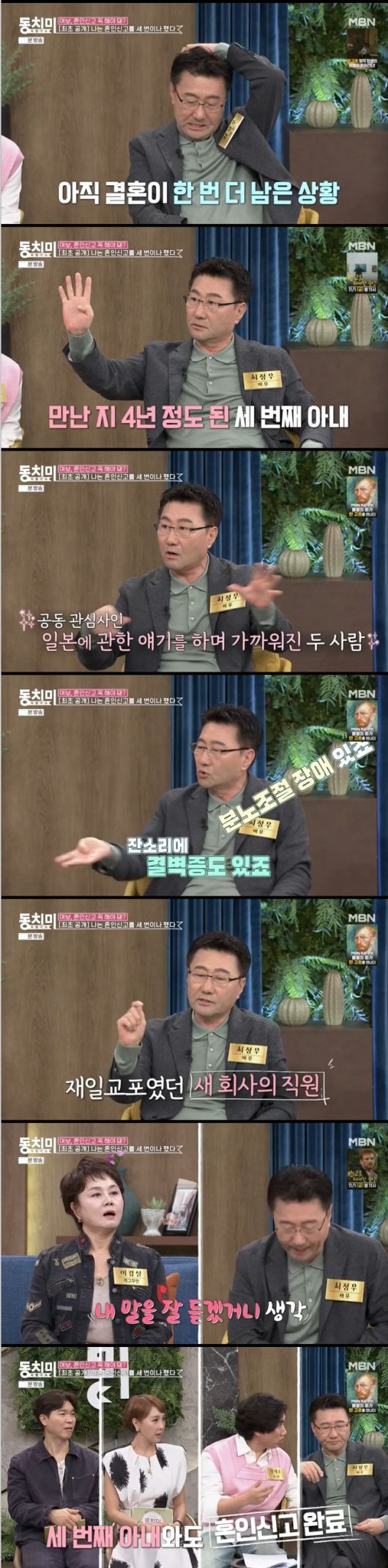 세 번째 아내에 대해서는 "최강의 아내를 만났다. 4년 정도 됐다. 회사를 옮긴다고 계약을 하는데 그 집이 다이닝바였다. 새 회사의 직원이고 재일교포였다. 일본 이야기를 나누다 만났는데 잔소리에 결벽증, 분노조절 장애, ADHD가 있다. 나와 너무 안 맞는다. 11살 차이에 초혼이다. 화 나면 내게 '영감님'이라고 말한다 동네에서 싸움닭이라고 소문났다. 연애할 때는 꼬랑지 내리고 숨겼다. 말 잘듣겠다 했는데 결혼 후 점점 바뀌었다"라며 아내 디스를 거침없이 했다.