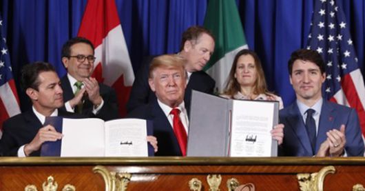 지난 2018년 열린 美·멕시코·캐나다 협정 서명식에 참석한 3국 정상. 왼쪽부터 엔리케 페냐 니에토 멕시코 대통령, 도널드 트럼프 미국 대통령, 쥐스탱 트뤼도 캐나다 총리. AP=연합뉴스 |