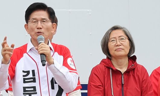 이수정 국민의힘 경기 수원정 당협위원장이 16일 오전 경기 화성시 동탄 센트럴파크에서 김문수 국민의힘 대통령 후보가 유세하는 모습을 지켜보고 있다. 신소영 기자 viator@hani.co.kr |