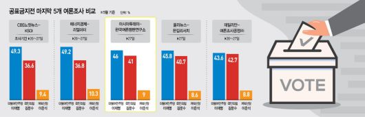 아시아투데이 한대의 기자 = 28일 6·3대통령선거 여론조사공표금지기간을 앞두고 마지막 대선후보 지지도를 조사한 여론조사 기관들의 후보 지지율 결과가 나왔다. 5개 여론조사 기관(한국여론평판연구소, 리얼미터, 여론조사공정, 한국사회여론연구소, 한길리서치)의 여론조사 결과를 보면, 이재명 더불어민주당 대선후보와 김문수 국민의힘 대선후보 지지율 차는 가장 적을 때 0.9%였고 가장 많을 때 12.7% 였다. 지지율 차는 이 중 아시아투데이·한국여론평판연구소 여론조사 결과가 다른 여론조사와 비교했을 때 중간 값을 나타냈다.