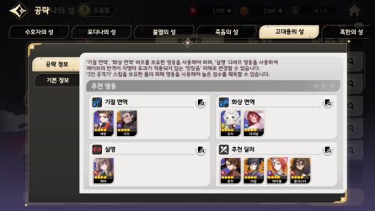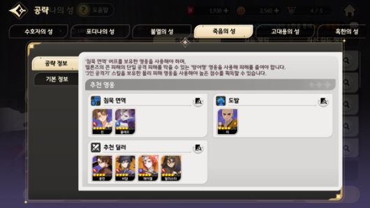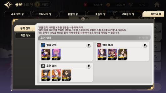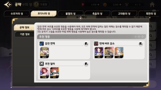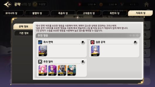지옥의 성은 다른 요일과 달리 1인 및 5인 스킬 피해량 감소 효과가 없다. 따라서 세인, 파스칼 같은 단일 딜러의 강력한 화력이 오히려 빛을 발휘하는 구간이다. 하지만 크리스가 사용하는 즉사 효과 때문에 즉사 면역 영웅 '레오'의 기용은 필수다.