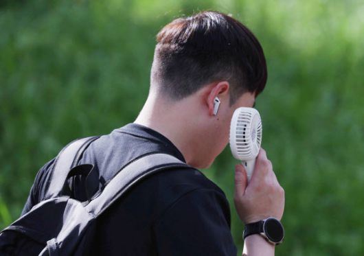 지난 21일 서울 종로구 일대에서 반팔을 입은 시민이 손선풍기를 사용하며 출근하고 있다. (사진=뉴시스) |