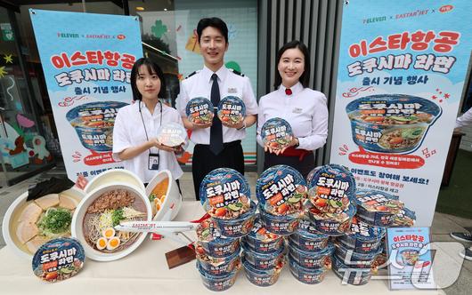 (서울=뉴스1) 박세연 기자 = 28일 서울 송파구 세븐일레븐 챌린지스토어점에서 열린 이스타항공 ‘도쿠시마 라면’ 출시 기념행사에서 이스타항공 직원과 하림 직원이 라면을 들고 홍보하고 있다. 이스타항공이 일본 도쿠시마 노선을 홍보하기 위해 하림과 협력해 출시한 이 라면은 28일부터 전국 세븐일레븐에서 구매할 수 있으며 6월부터는 이스타항공 기내에서도 만나볼 수 있다. 2025.5.28/뉴스1