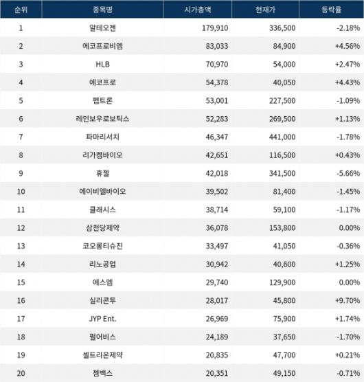 한편 시가총액 20위권 종목들은 알테오젠 ▼2.18%, 에코프로비엠 ▲4.56%, HLB ▲2.47%, 에코프로 ▲4.43%, 펩트론(087010) ▼1.09%, 레인보우로보틱스 ▲1.13%, 파마리서치(214450) ▼1.78%, 리가켐바이오(141080) ▲0.43%, 휴젤 ▼5.66%, 에이비엘바이오(298380) ▼1.45% 등의 성적을 기록하고 있다.