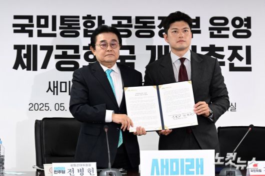 전병헌(왼쪽) 새미래민주당 상임선대위원장과 김용태 국민의힘 비상대책위원장이 28일 서울 여의도 새미래민주당사에서 열린 국민통합 공동정부 운영과 제7공화국 개헌추진 협약식에서 협약서에 서명하고 기념촬영을 하고 있다.