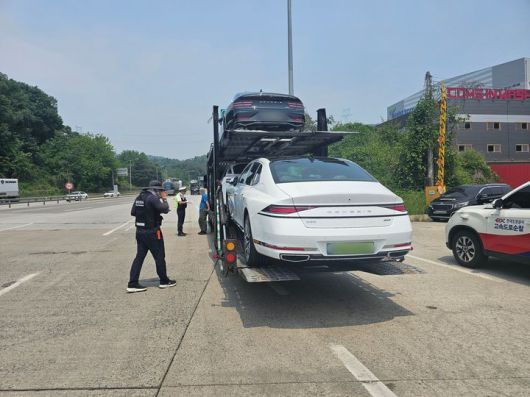 28일 오전 11시27분 경기 용인시 양지톨게이트 앞. 신차 4대를 싣고 가던 카 캐리어가 경기남부경찰청 고속도로순찰대에 적발됐다.