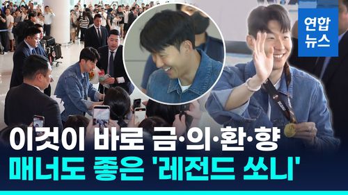"잘생겼다", "손(Son)" 등 팬들의 환호를 뒤로 하고 입국장을 빠져나간 손흥민은 차량 탑승 직전 "메달을 목에 걸어 달라"는 팬들의 요청에 잠시 2024-2025 유럽축구연맹(UEFA) 유로파리그(UEL) 우승 메달을 걸고 다시 한번 활짝 웃기도 했습니다.