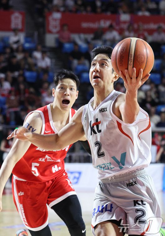 23일 오후 서울 송파구 잠실학생체육관에서 열린 2024-2025 프로농구 4강 플레이오프 1차전 서울 SK 나이츠와 수원 KT 소닉붐의 경기에서 KT 허훈이 슛을 하고 있다. 2025.4.23/뉴스1 ⓒ News1 신웅수 기자 |