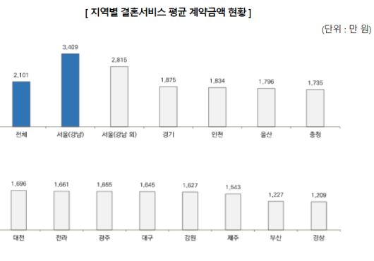 결혼식을 치르는 데 드는 서비스 비용이 전국 평균 2101만원으로 조사됐다. 서울 강남에서는 경상도의 3배에 육박하는 약 3400만원의 비용이 드는 것으로 파악됐다.