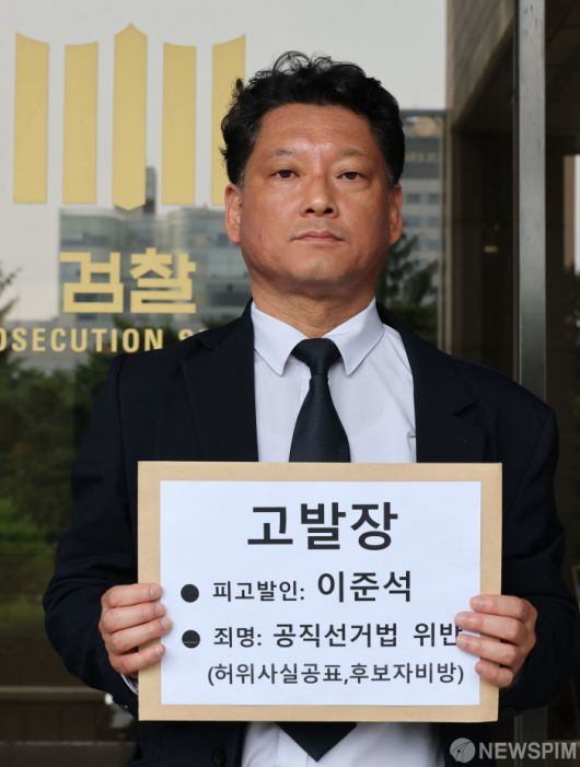 [서울=뉴스핌] 김학선 기자 = 김한메 사법정의바로세우기시민행동 상임대표가 28일 서울 서초구 서울중앙지검에서 이준석 개혁신당 대선 후보를 공직선거법 위반(허위사실공표, 후보자 비방) 혐의로 검찰에 고발하기 위해 고발장을 들고 있다. 2025.05.28 yooksa@newspim.com