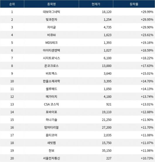 6위 아이티센엔텍(010280)은 종가 1,027원으로 18.59% 상승 마감했다. 7위 시지트로닉스(429270)는 종가 6,100원으로 18.22% 상승 마감했다. 8위 온코크로스(382150)는 종가 13,880원으로 17.63% 상승 마감했다. 9위 비트맥스(377030)는 종가 3,640원으로 15.01% 상승 마감했다. 10위 한울소재과학(091440)은 종가 3,395원으로 14.70% 상승 마감했다.