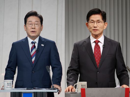 이재명 더불어민주당 대선후보(왼쪽)과 김문수 국민의힘 대선후보 제21대 대선 토론회에 참가한 모습. [사진=국회사진기자단] |