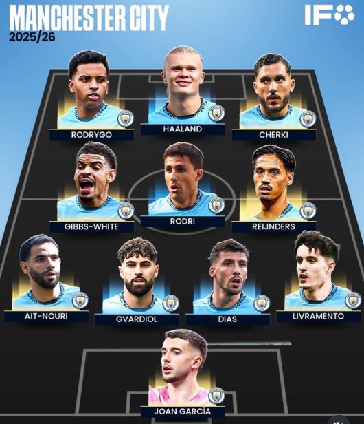 축구 매체 '아이디오 마풋'은 28일(한국시간) 이적설이 나는 선수들로 맨시티의 2024-25시즌 예상 라인업을 내놓았다. 11명 중 기존 선수는 엘링 홀란, 로드리, 요수코 그바르디올, 후벵 디아스만 있었다. 홀란드와 함께 호드리구, 라얀 셰르키가 있었다. 호드리구는 카를로 안첼로티 감독이 떠나고 사비 알론소 감독이 오며 레알을 떠날 선수로 평가된다. 아스널과 더불어 맨시티가 노린다. 리옹에서 독보적 활약을 한 셰르키는 맨시티 측면을 책임질 적임자로 평가된다.
