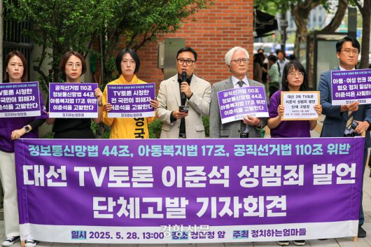 시민단체 ‘정치하는 엄마들’이 28일 서울 서대문 경찰청 민원실 앞에서 이준석 개혁신당 대선후보의 성범죄 발언을 고발하는 기자회견을 하고 있다. 이준헌 기자 |