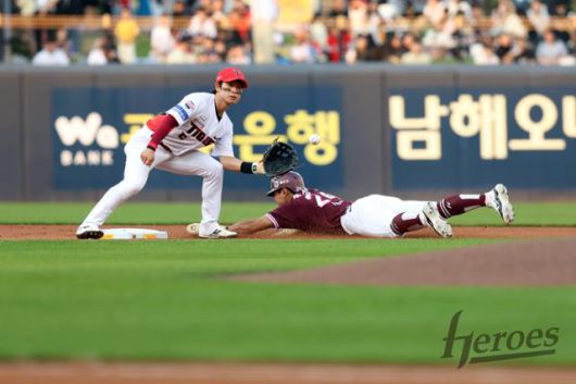 송성문은 28일 광주 KIA챔피언스 필드에서 열린 KIA와 원정 경기에 1번 3루수로 선발 출전해 1회 첫 타석부터 2루 베이스를 훔쳤다. KIA 선발 양현종을 상대로 중전 안타를 친 뒤 2번 최주환 타석 때 도루를 추가했다.