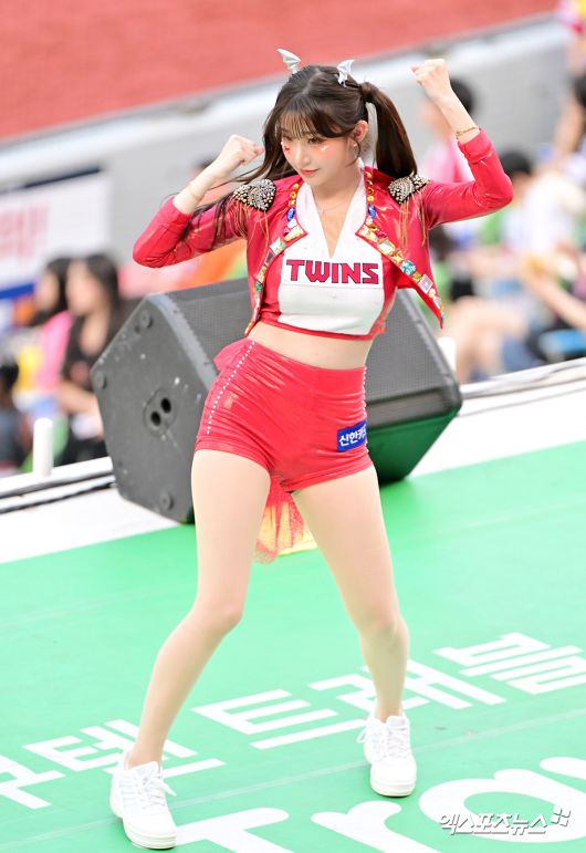 (엑스포츠뉴스 잠실, 김한준 기자) 28일 오후 서울 송파구 잠실야구장에서 열린 '2025 신한 SOL Bank KBO리그' 한화 이글스와 LG 트윈스의 경기, 이주은 치어리더가 멋진 공연을 선보이고 있다.