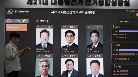 제21대 대통령 선거 사전투표를 하루 앞둔 28일 경기도 과천시 중앙선거관리위원회에서 직원이 후보자 등록 현황 상황판을 보고 있다. |