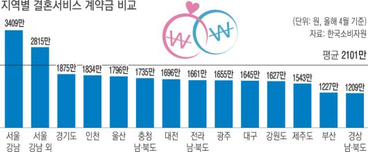 결혼식을 치르는 데 드는 서비스 비용이 전국 평균 2101만원으로 조사됐다. 서울 강남에서는 경상남·북도의 3배에 육박하는 약 3400만원이 드는 것으로 파악됐다.