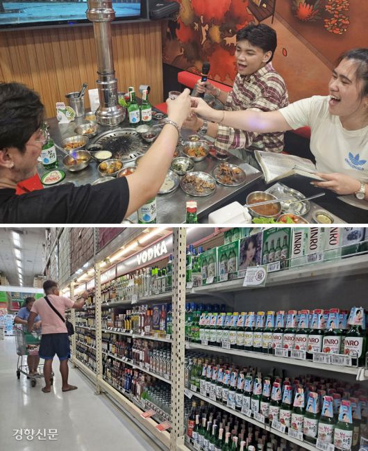필리핀에 흔한 한국 먹자골목 풍경 필리핀 마닐라의 ‘삼겹살라맛’에서 현지인들이 소주잔을 부딪치며 “타가이(건배)”를 외치고 있다(위쪽 사진). 지난 19일 창고형 할인매장 S&R에 진로 소주들이 가득 진열돼 있다. 마닐라 | 하이트진로 제공·정유미 기자 |