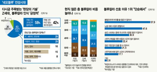 김석집 네모파트너즈POC 대표는 “블루칼라 일자리는 업무량과 책임성이 명확해 업무의 시작과 종료가 분명하다. 업무량과 보수가 비례하며, 수평적 동료 관계라는 점에서 조직 내 스트레스도 적다”며 “이는 공정과 워라밸을 중시하고 개인주의 경향이 강한 Z세대 특성과 잘 맞는다”고 분석했다.