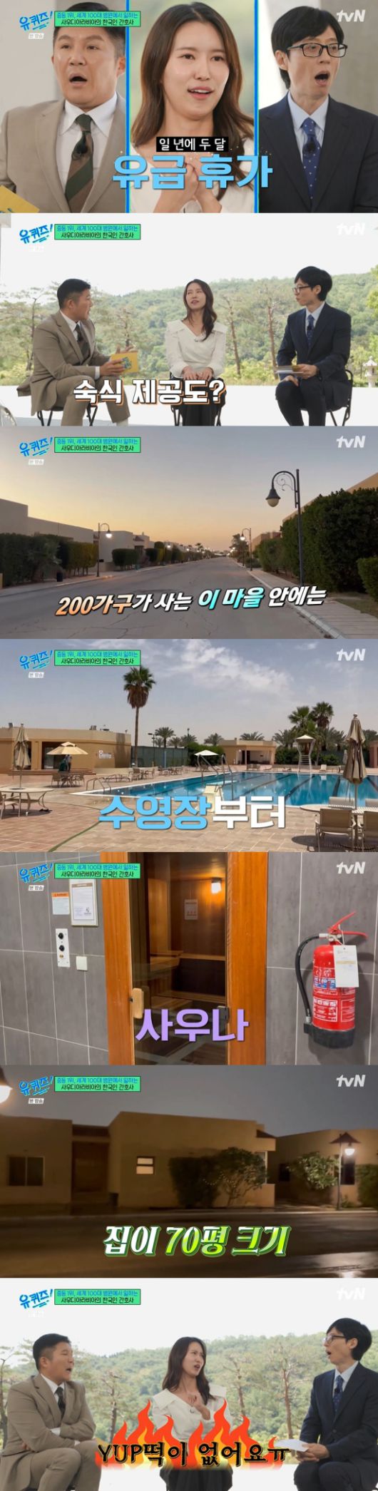 조세호는 "숙식 제공도 해주냐"라며 관심을 나타냈고, 차민아 간호사는 "병원에서 무료로 숙소를 제공을 해준다. 컴파운드라고 하는데 컴파운등데 200가구 이상 집들이 있다"라며 야외 수영장, 테니스장, 헬스장, 사우나, 스쿼시장, 에어로빅장, 슈퍼마켓 등을 촬영한 영상을 공개했다.