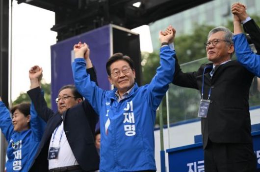 이재명 더불어민주당 대선 후보가 28일 서울 광진구 어린이대공원 정문 앞에서 열린 유세에서 유홍준 교수 등과 함께 인사하고 있다. 2025.5.28 김현민 기자 |