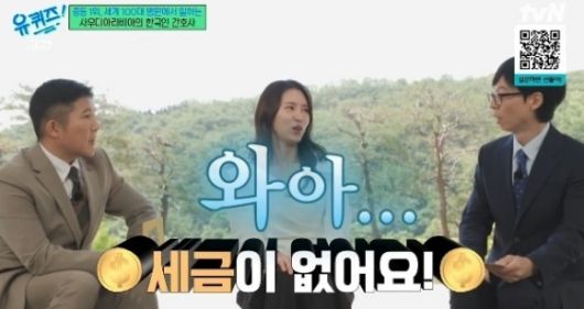 유재석은 "사우디에서 간호사 하시면 월급을 굉장히 많이 받으실 것 같은데"라고 물었고, 차민아 씨는 "그렇진 않다. 생각하시는 것만큼 많진 않고 월 500~600만 원 정도 된다. 한국에 비해서 높은 수준이긴 하지만 미국, 호주보다는 연봉이 높지 않다"고 답했다.