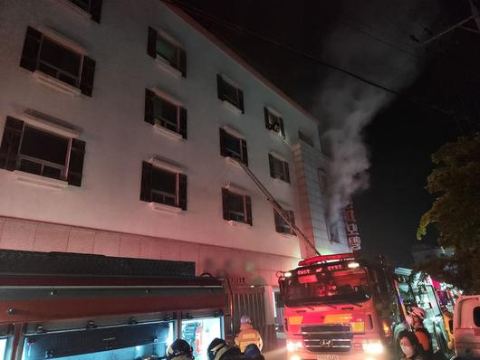 [서산=뉴시스] 28일 오후 9시33분께 충남 서산시 동문동의 한 모텔에서 불이 나 연기가 하늘로 치솟고 있다. (사진=독자 제공) 2025.05.28. photo@newsis.com *재판매 및 DB 금지
