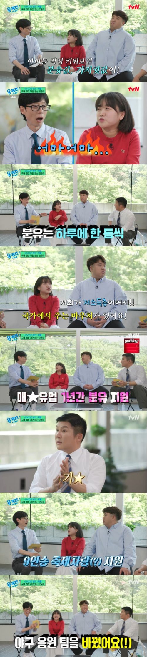 오둥이를 위해 매일유업에서 1년간 분유 지원, 베베쿡에서 이유식 지원, 기아에서는 9인승 축제 차량을 지원해줬다고. 이에 아내는 "그래서 야구 응원팀을 바꿨다. 기아 타이거즈로"라고 고백해 웃음을 자아냈다.