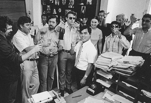1973년 5월, 정확한 날짜는 알려지지 않은 이 사진은 AP통신 사이공(현 호찌민) 지국 직원들이 닉 우트의 퓰리처상 수상 소식을 축하하는 모습을 담고 있다. 가운데 반팔 셔츠에 넥타이를 매고 있는 인물이 닉 우트이며, 그의 옆에 선글라스를 쓰고 샴페인 병을 든 사람이 칼 로빈슨이다. 왼쪽에서 두 번째가 호르스트 파스다. AP 뉴시스 |