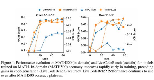 그런데 결과는 예상을 뛰어넘었다. MATH라는 수학 문제 데이터셋으로만 학습시킨 후, 코딩 테스트에 투입했을 때의 일이다. INTUITOR로 학습한 모델은 LiveCodeBench에서 기존 대비 65% 상대적 향상을, CRUXEval에서는 76% 향상을 보였다.