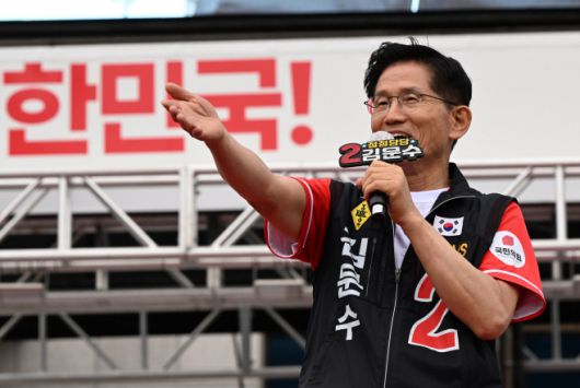 김문수 국민의힘 대선 후보가 28일 경남 영천시 영천역 앞 광장에서 열린 유세에서 지지를 호소하고 있다. /송의주 기자 |
