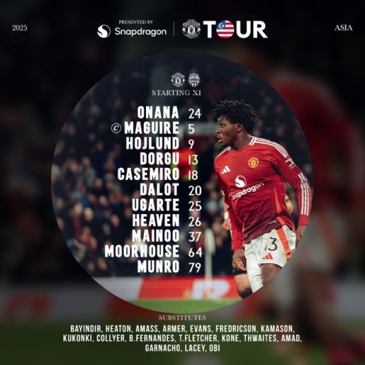 하지만 경기가 풀리지 않자, 아모림은 빠르게 변화를 단행했다. 전반 32분 달로, 매과이어, 카세미루, 무어하우스를 빼고 제이든 카마손, 시어 레이시, 세쿠 코네, 다니엘 제임스 아르머 등 어린 선수들이 대거 투입됐다.