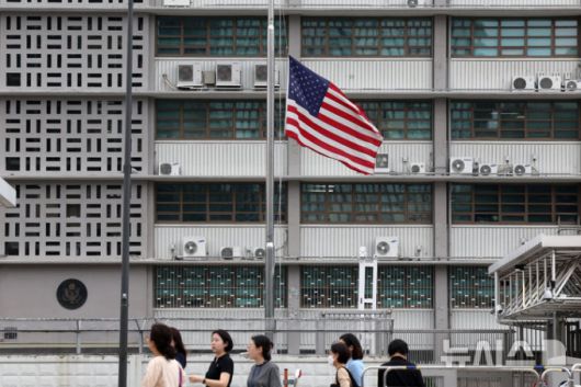 9.11 테러 발생 23주기를 맞은 2024년 9월11일 서울 종로구 주한 미국대사관 게양대에 조기가 걸려있다. /사진=뉴시스 |