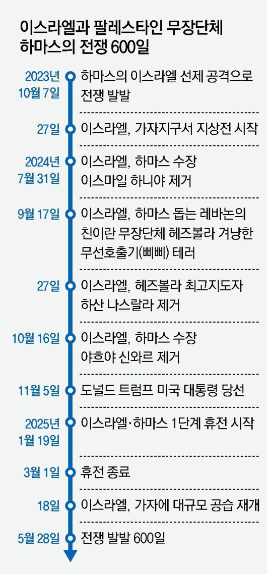 2023년 10월 7일 발발한 이스라엘과 팔레스타인 무장단체 하마스의 전쟁이 28일로 꼭 600일을 맞았다. 이 기간 동안 하마스가 통치하는 가자지구에서만 최소 5만4056명이 숨진 가운데 식량 부족 등 가자지구의 인도주의 위기도 고조되고 있다.