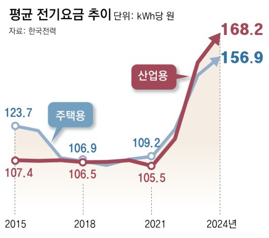 한전에 따르면 국내 산업용 전기료는 2021년 kWh당 105.5원에서 2024년 168.2원으로 59.4% 급등했다. 반면 같은 기간 주택용은 109.2원에서 156.9원으로 산업용보다 15.7%포인트 낮은 43.7% 상승했다. 이에 따라 2023년부터는 산업용 전기료가 주택용보다 비싸지는 역전 현상까지 나타났다. 한전 관계자는 “우크라이나 전쟁 이후 원료비 인상 등의 영향으로 누적 적자가 커지면서 전기요금을 인상할 수밖에 없었다”며 “가정용(주택용)보단 인상 여력이 있다고 판단해 산업용 전기요금을 (상대적으로 더 많이) 올렸다”고 설명했다.
