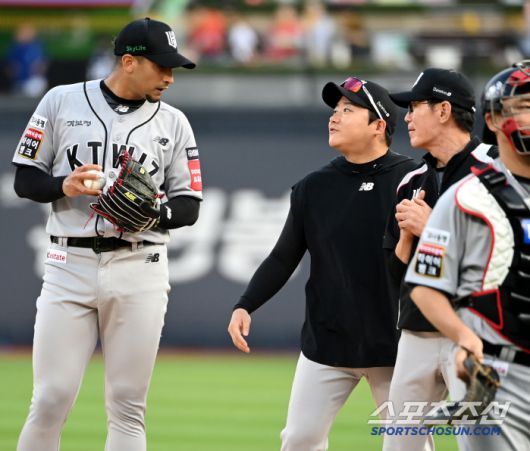 28일 수원KT위즈파크에서 열린 두산과 KT의 경기, 1회초 KT 쿠에바스가 1사 1,3루의 위기를 맞자 이강철 감독이 마운드에 올라와 이야기를 하고 있다. 수원=허상욱 기자wook@sportschosun.com/2025.05.28/ |