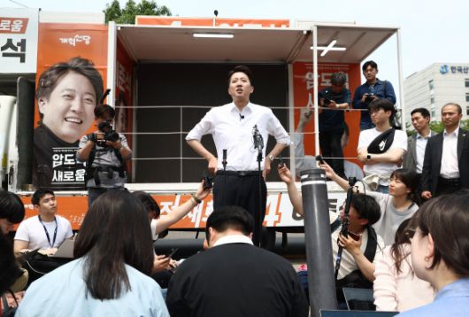 이준석 개혁신당 대선 후보가 28일 서울 영등포구 여의도공원에서 유세를 마친 뒤 취재진과 질의응답하고 있다. 이 후보는 전날 TV 토론에서 했던 여성 신체 관련 발언이 논란이 되자 “심심한 사과를 하겠다”고 밝혔다. 뉴스1 |