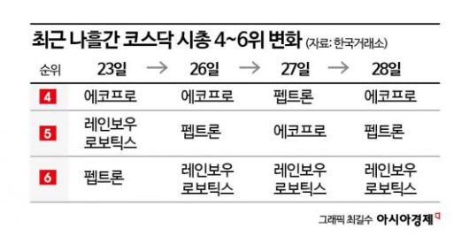 29일 한국거래소에 따르면 전일 에코프로가 6% 넘게 상승하면서 하루만에 4위를 탈환했다. 이로써 코스닥시장 시총 5위의 주인이 나흘 연속 바뀌었다. 지난 26일 펩트론이 레인보우로보틱스를 제치고 5위로 올라선 데 이어 27일에는 에코프로마저 제치고 4위에 올라섰다. 하지만 하루만에 다시 에코프로에게 자리를 내주고 5위로 돌아갔다.