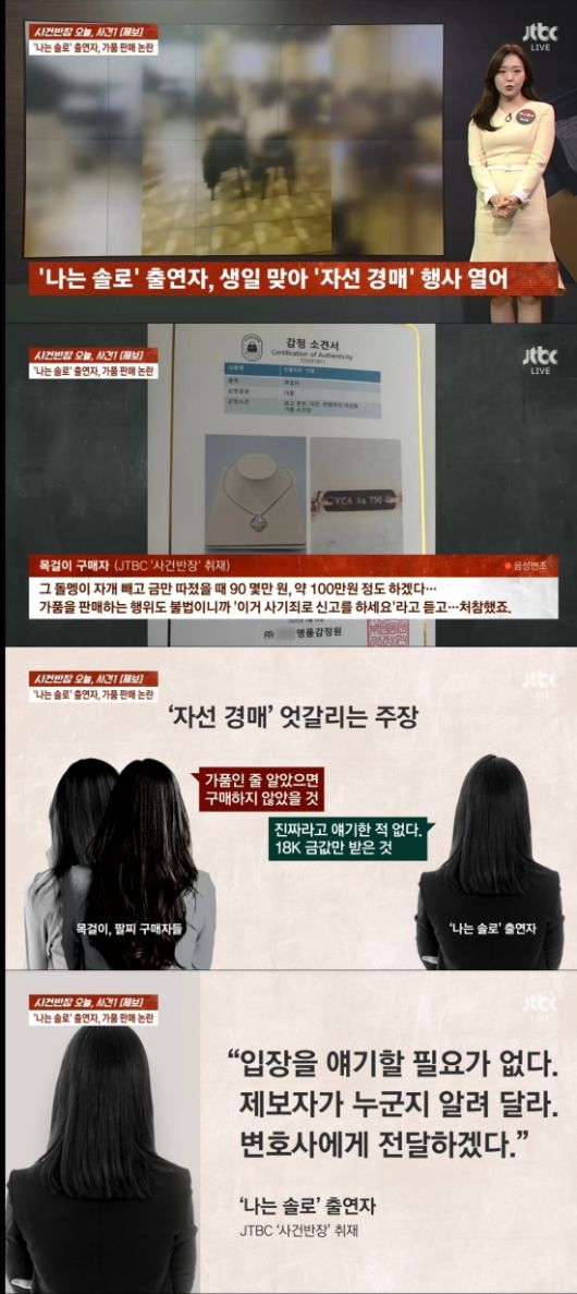28일 방송된 JTBC '사건반장'에서는 ENA, SBS Plus '나는 솔로(나는 SOLO)' 여성 출연자 A씨가 자선 행사에서 가품을 명품으로 속였다는 의혹을 다뤘다.