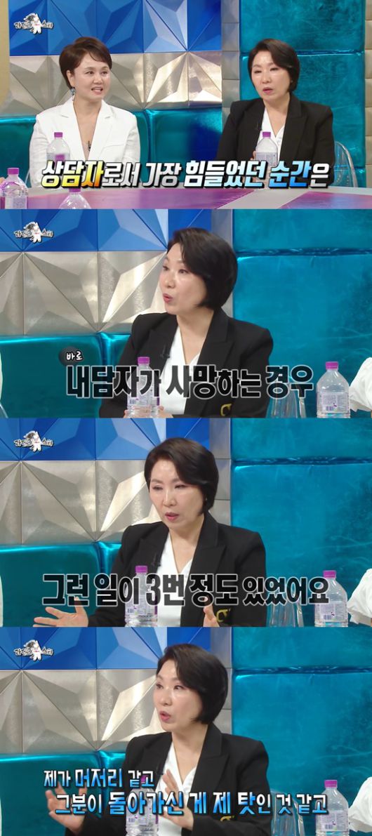 그는 "상담하면서 가장 힘든 상황은 내담자가 사망하는 경우"라면서 "저한테 3번 정도 있었다. 원래 우울증 같은 걸 겪던 분들이 새 고비가 왔을 때 힘들어하실 때가 있다"고 언급했다.
